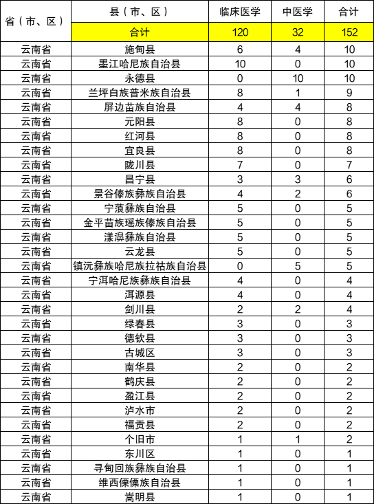 2024年云南定向医学生共招生152人,其中临床医学专业120人、中医学专业32人。招生人数最多的十个地区如下: