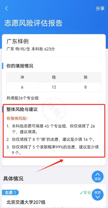 这对于高考生来说也是非常有用和人性化的,很多同学或许并不明白冲稳保应该各自填报多少学校合适,考生使用该软件进行志愿风险评估后,软件就会为大家提供合适的修改建议。还可以根据大家选择的学校和专业,大概预估落榜风险的高低,帮助大家做到心里有数。