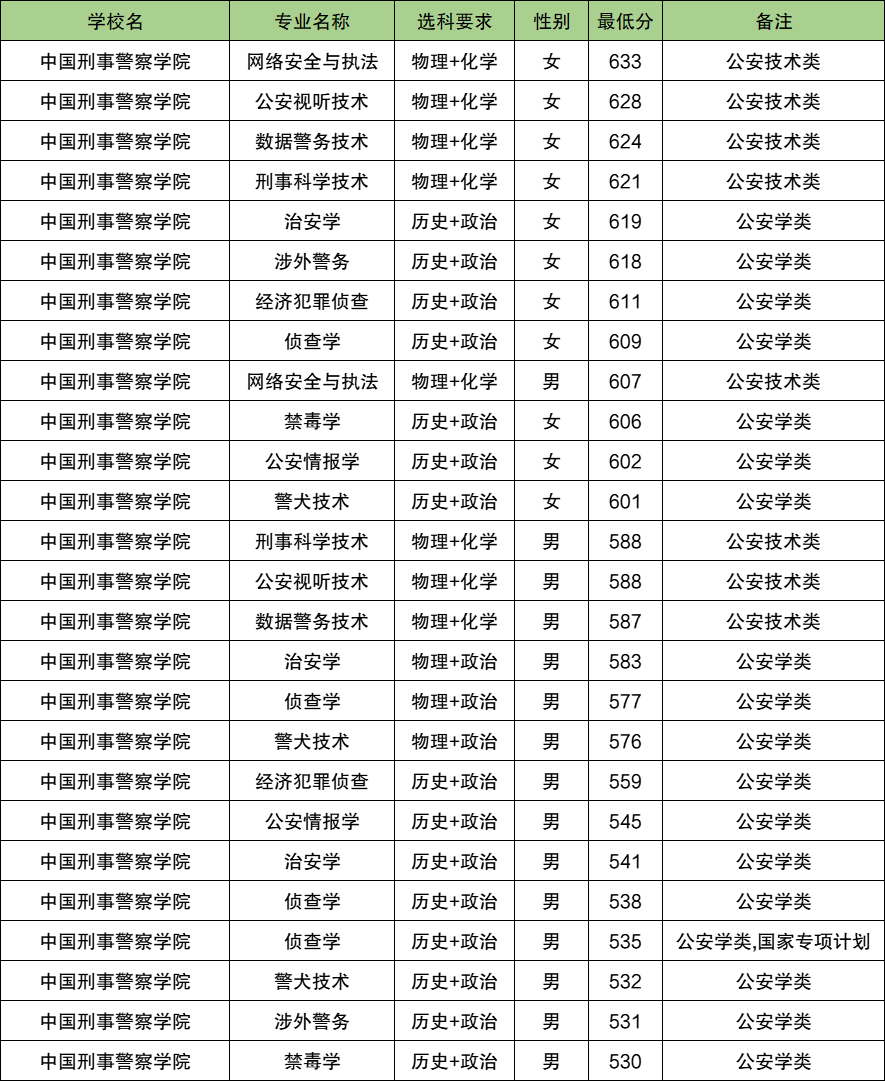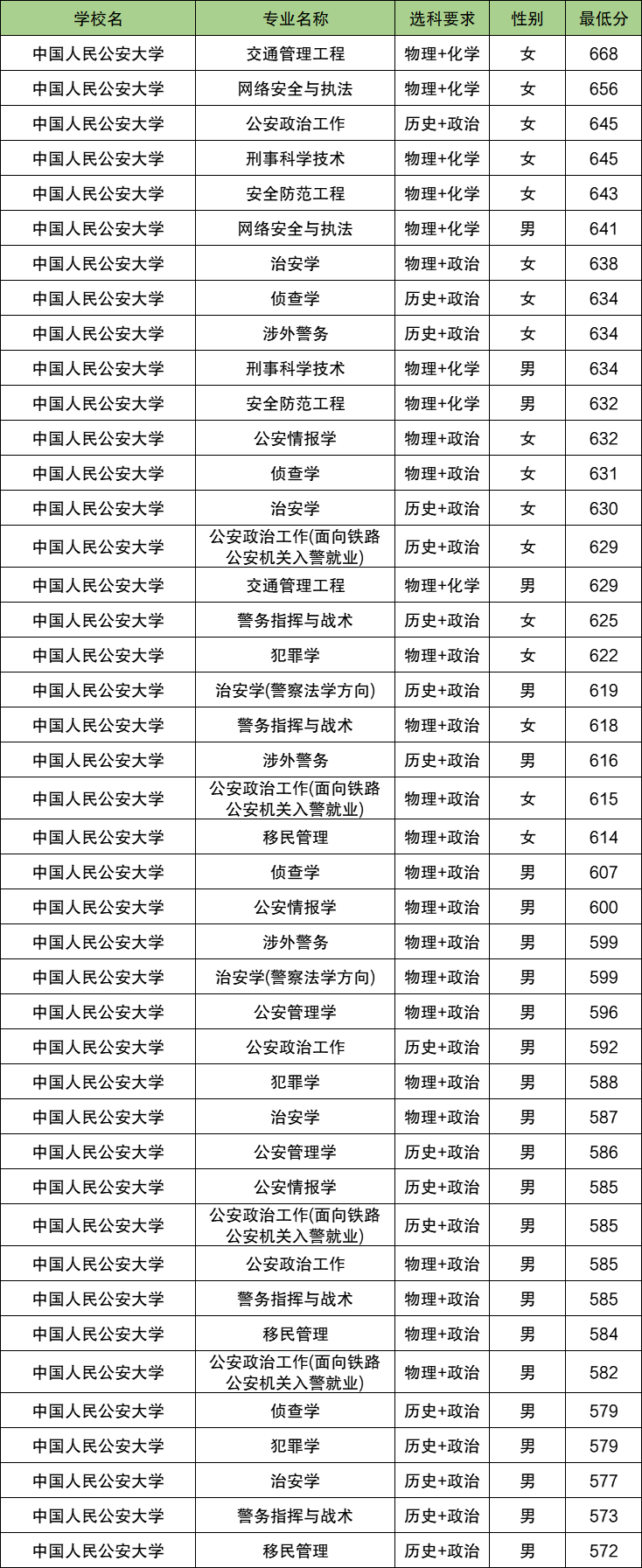 | 中国人民警察大学 | 物理+化学 | 女 | 618 |