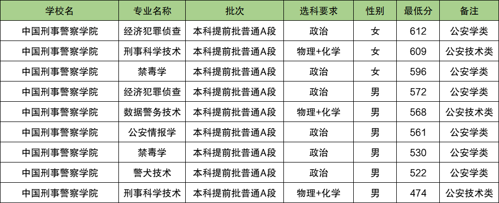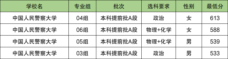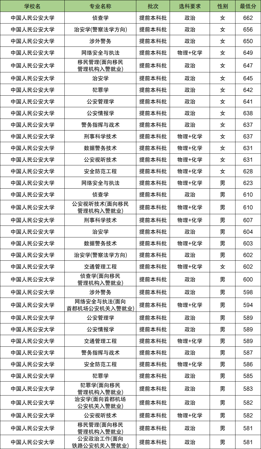 3、中国人民公安大学:北京最低581分,对应公安政治工作(面向铁路公安机关入警就业)专业。2024年在北京市有侦查学、治安学(警察法学方向)、涉外警务、网络安全与执法、移民管理(面向移民管理机构入警就业)、治安学、犯罪学、公安管理学、公安情报学等21个专业。