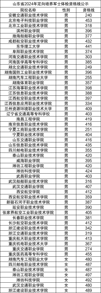 2024年山东定向士官学校录取分数线目前尚未公布,但我们可以先了解2024年山东定向士官面试体检分数线,以此作为2025年报考定向士官学校的一个参考。下面为大家整理2024年山东定向士官体检资格线最低分,包括男生和女生,具体如下: