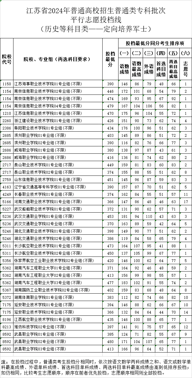 2024年江苏历史类定向士官学校的录取分数线在366分-479分之间,历史类录取分数线最高的是南京信息职业技术学院04专业组(不限),2024年投档最低分为479分;录取分数线最低的是河南交通职业技术学院01专业组(不限)和延安职业技术学院02专业组(不限),2024年投档最低分均为366分。