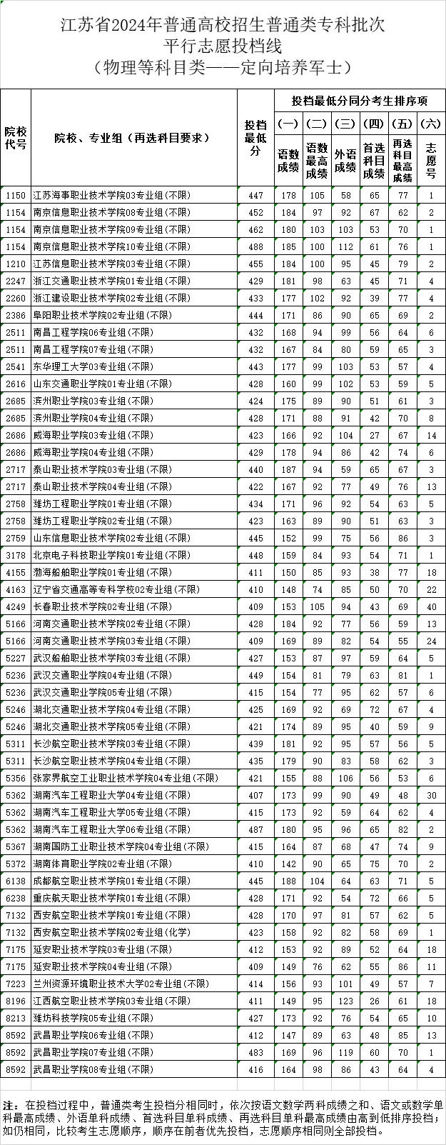 2024年江苏定向士官学校录取分数线物理类最高分488分,最低分407分;历史类最高分479分,最低分366分,具体分数线详情见下文。