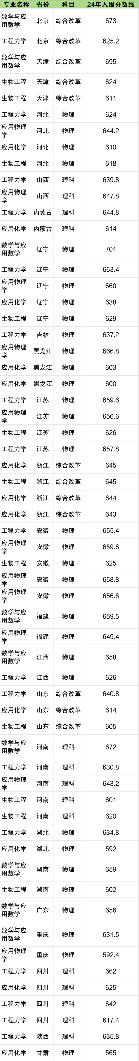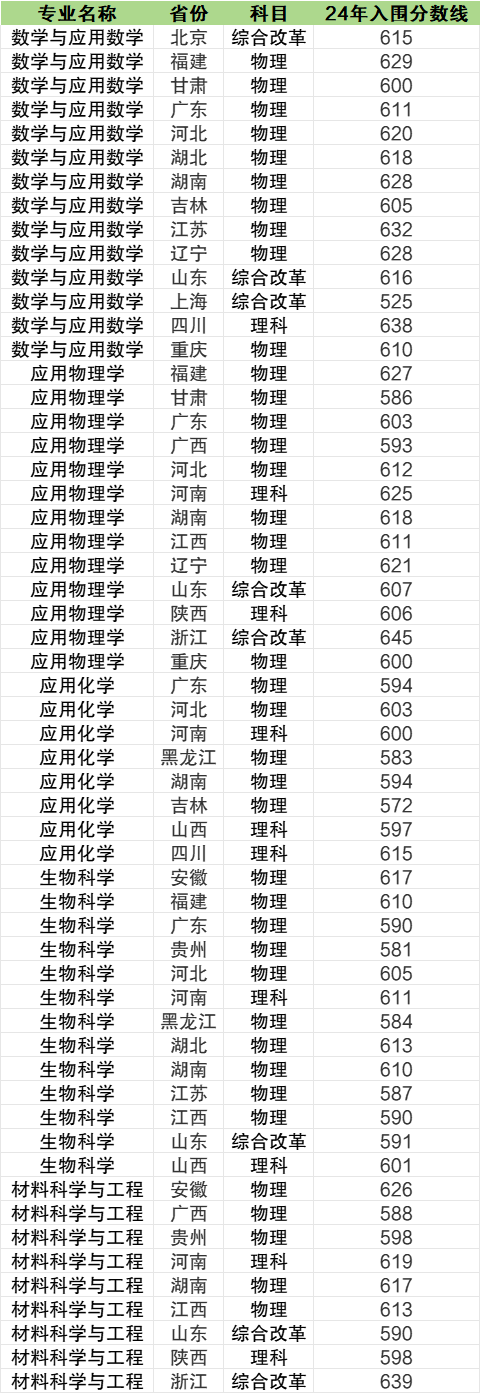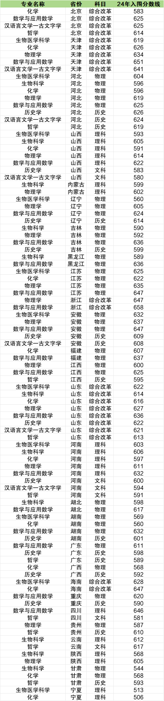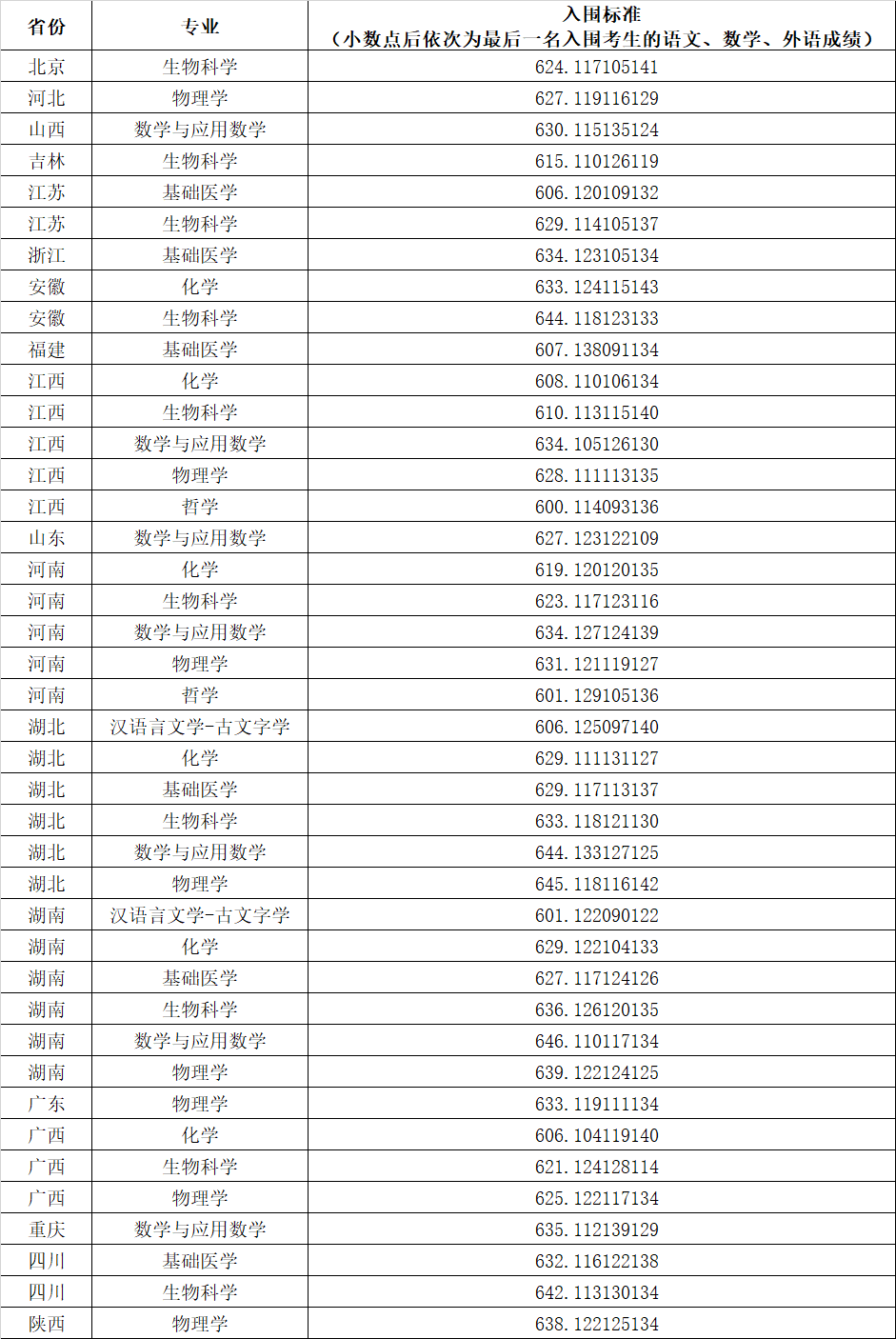 四川:汉语言文学最低596分、历史学类603分、哲学597分、数学与应用数学645分、物理学631分、化学629分、生物科学631分、工程力学625分、基础医学634分。