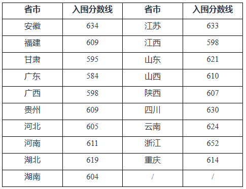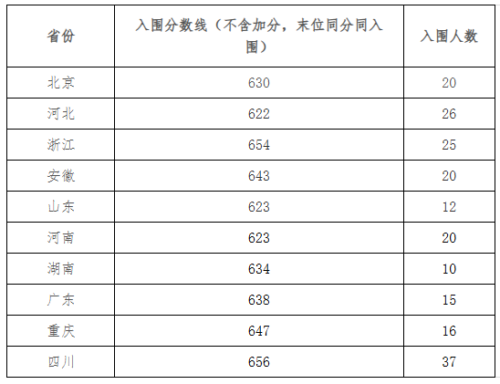 北京:630分入围人数20人、河北:622分入围人数26人、浙江:654分入围人数25人、四川:656分入围人数37人。