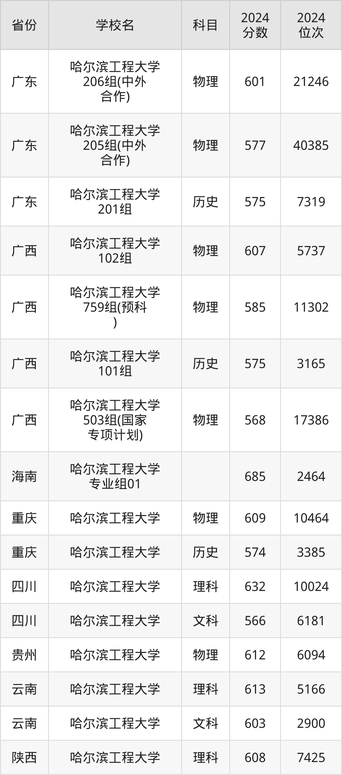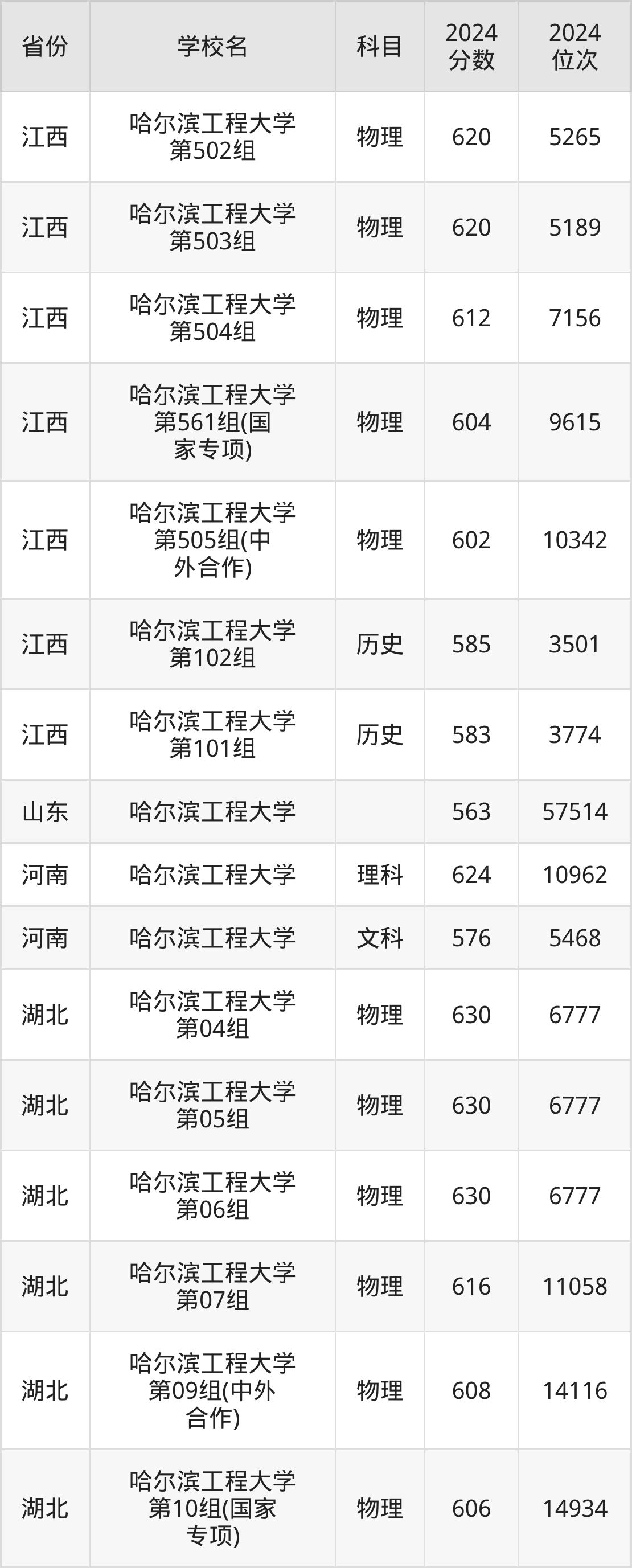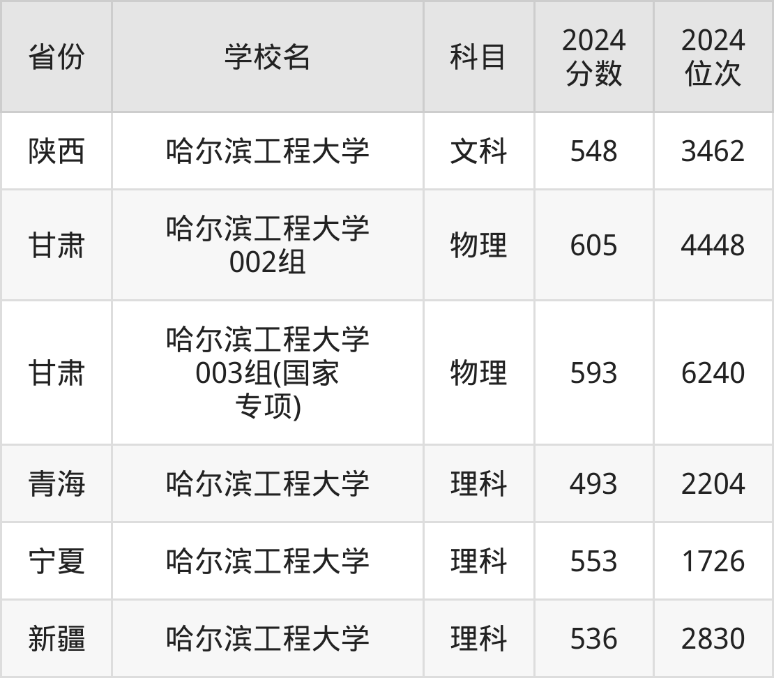 由于全国数据较多,因此本文仅展示哈尔滨工程大学省内近一年录取分数线汇总。