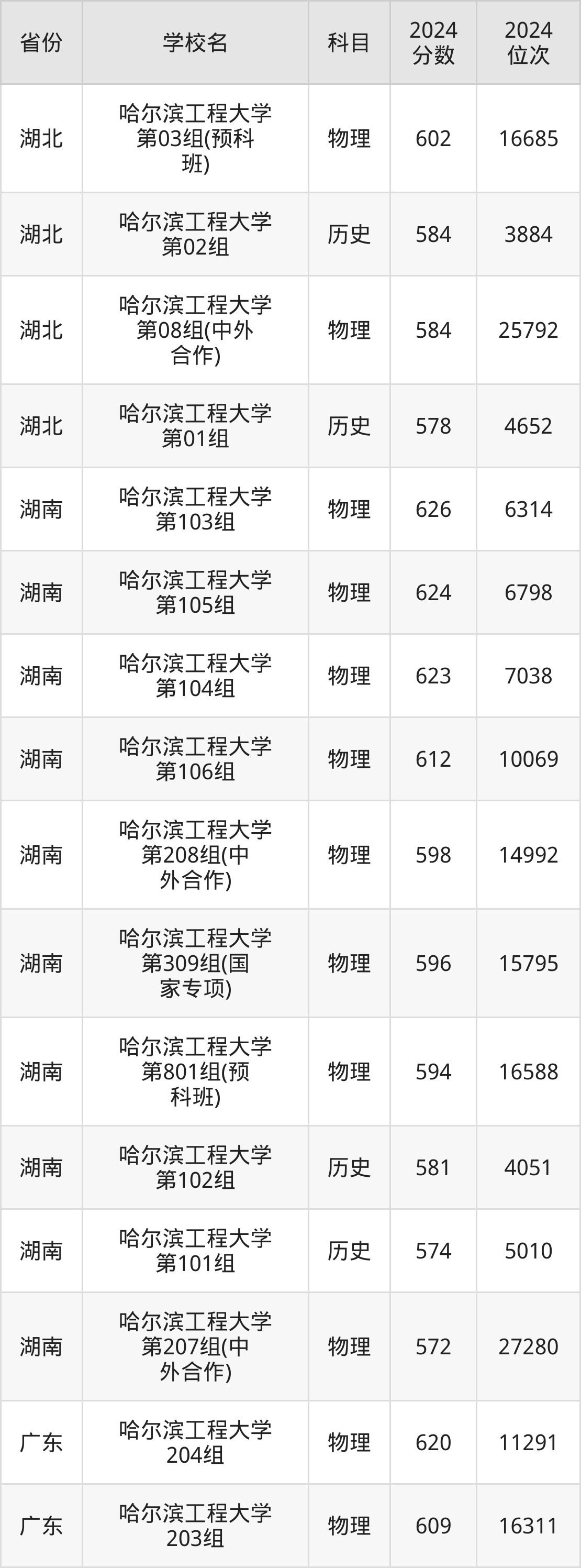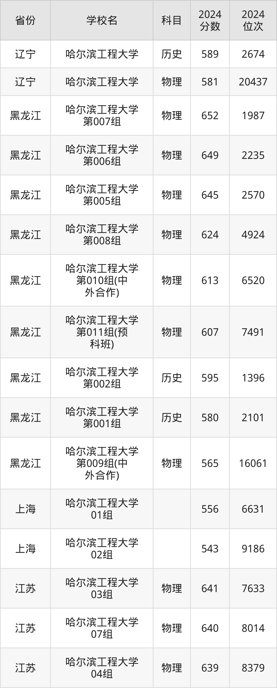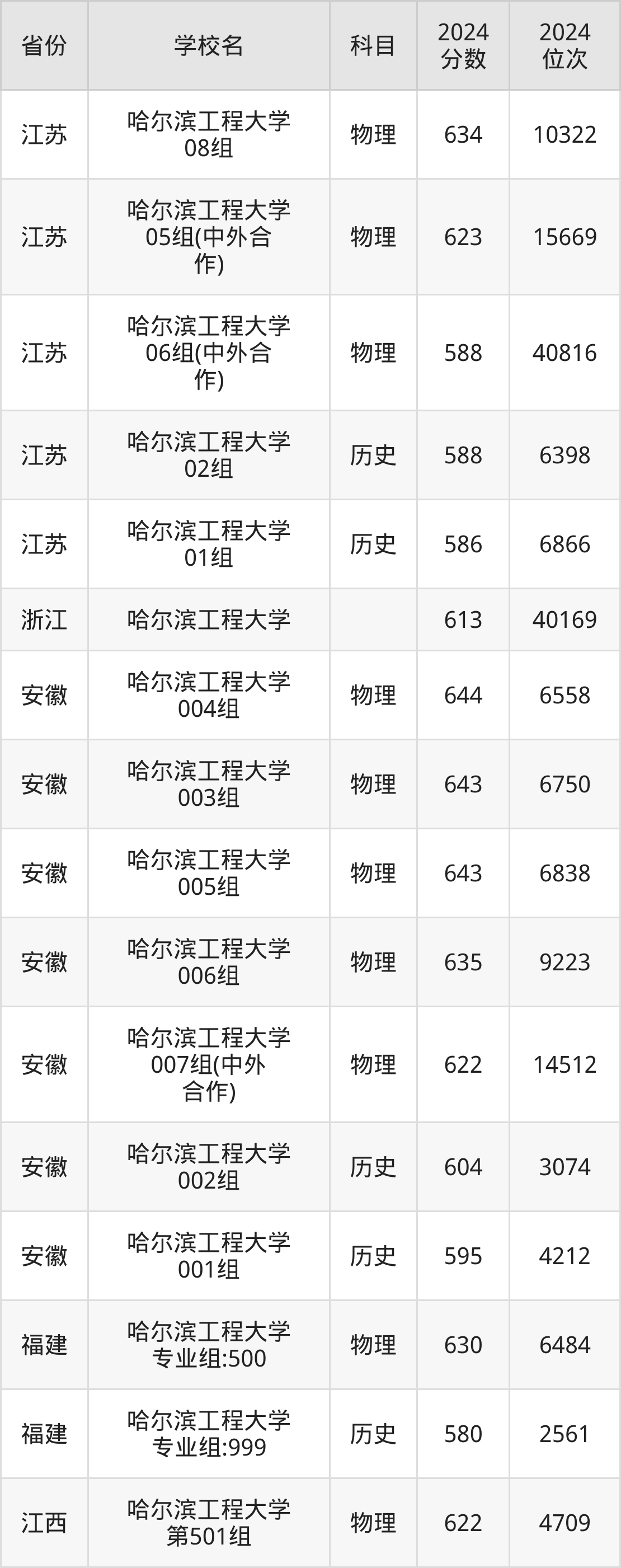 由于全国数据较多,因此本文仅展示哈尔滨工程大学省内近一年录取分数线汇总。