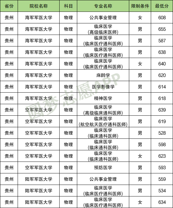 2024年海军军医大学在贵州物理类中,男生最低587分,女生最低608分;