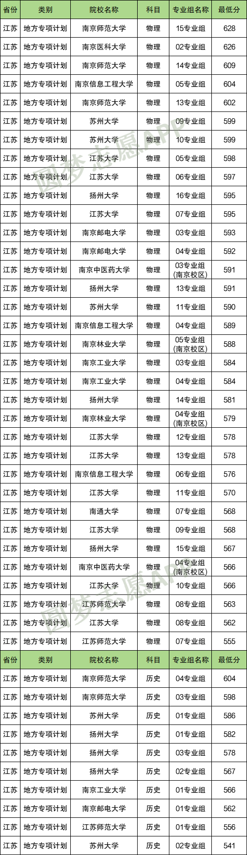 以下是江苏地方专项计划学校最低录取分数线: