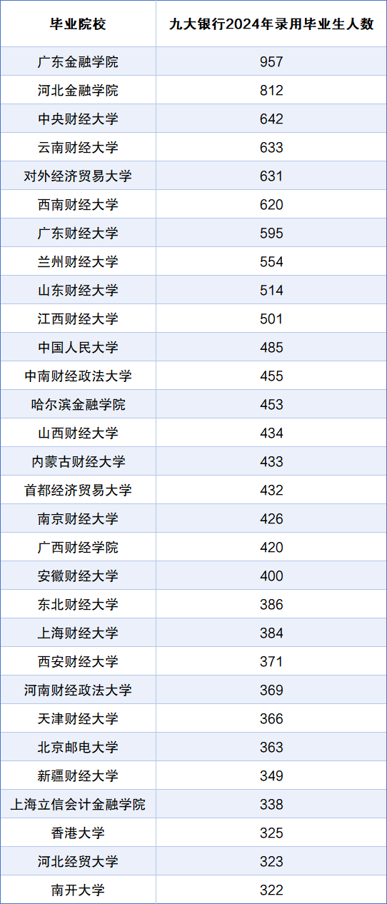 圆梦小编独家整理了:中国银行、中国人民银行、中国农业银行、中国建设银行、中国工商银行、中信银行、中国邮政储蓄银行、中国农业发展银行、中国光大银行2024年通过校园招聘96558位毕业生的数据,录用人数排名前30的大学名单如下: