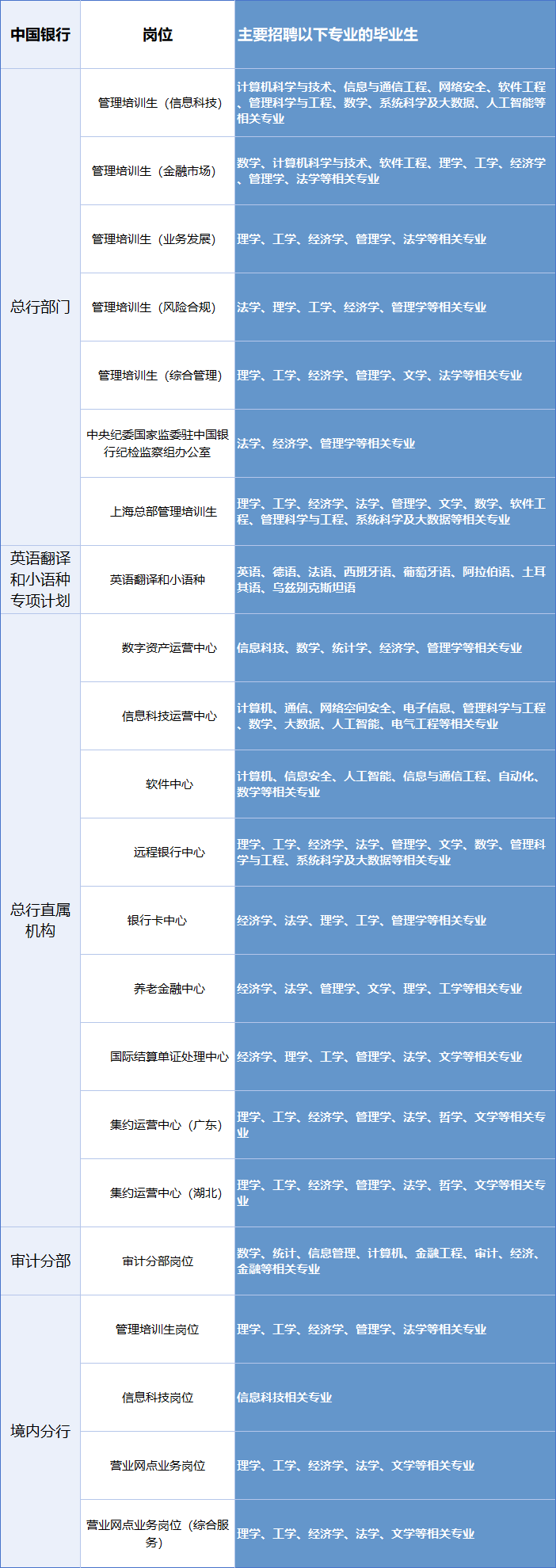 多数岗位主要招聘:经济学、管理学、理学、工学、法学、文学等相关专业的毕业生。