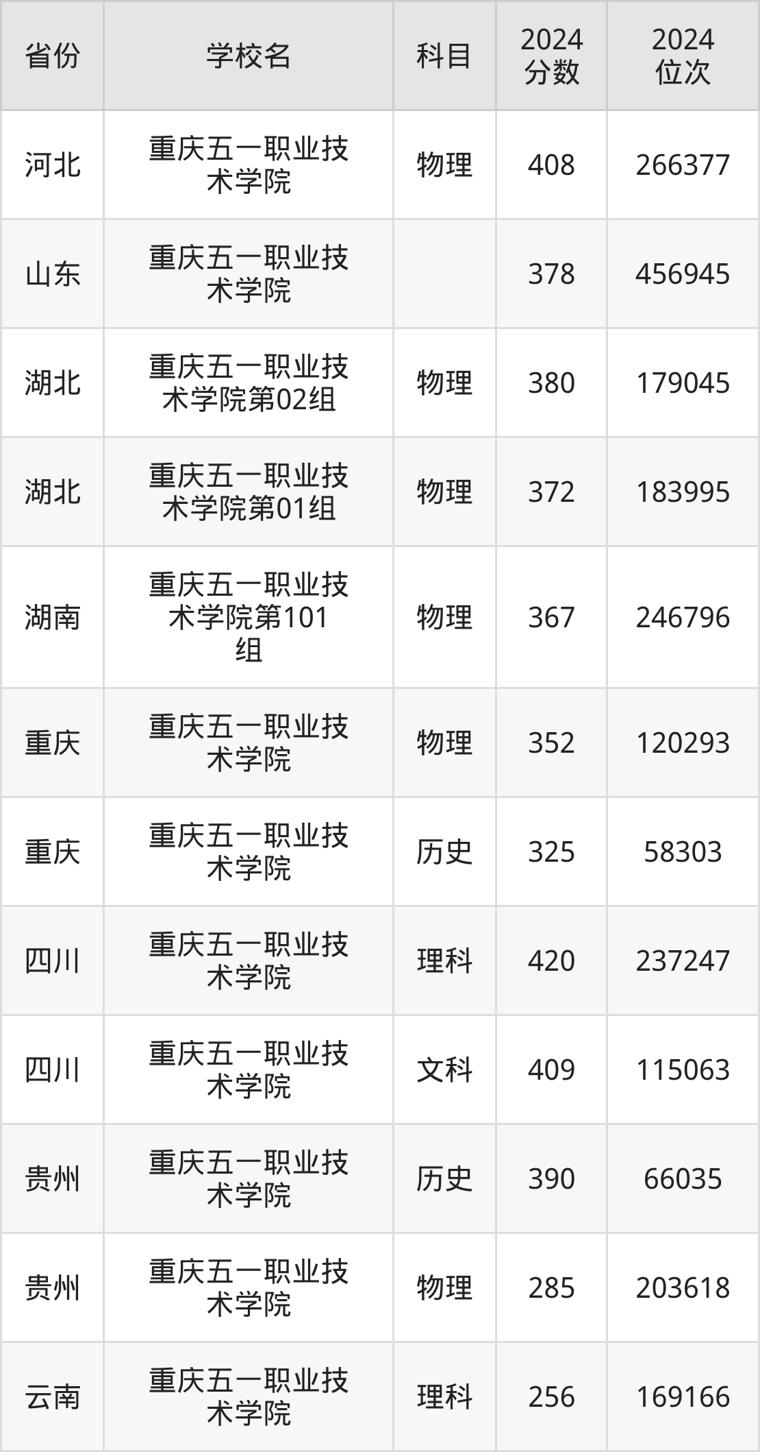 下面是重庆五一职业技术学院2024年录取分数线一览表: