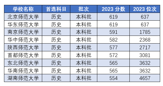 这十所师范大学2023年在辽宁省历史组的录取分数都超过了550分以上,其中福建师范大学未在辽宁历史组招生,历史组中录取分数最高的是北京师范大学和华东师范大学,录取分数都是619分,录取分数最低的是湖南师范大学,录取分数为554分。