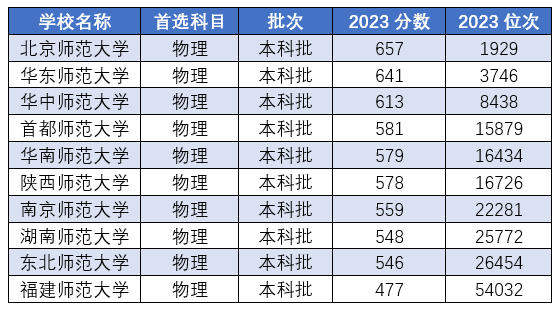 在2023年在辽宁省物理组中,这十所师范大学中录取分数超过600分的大学有三所,分别是北京师范大学、华东师范大学、华中师范大学,录取分数为657分、641分、613分,分数普遍都超过历史组的录取分数。但从录取分数最低的师范大学来看,历史组和物理组的差距较大,物理录取分数最低的大学是福建师范大学477分,和历史组的湖南师范大学相差了77分。