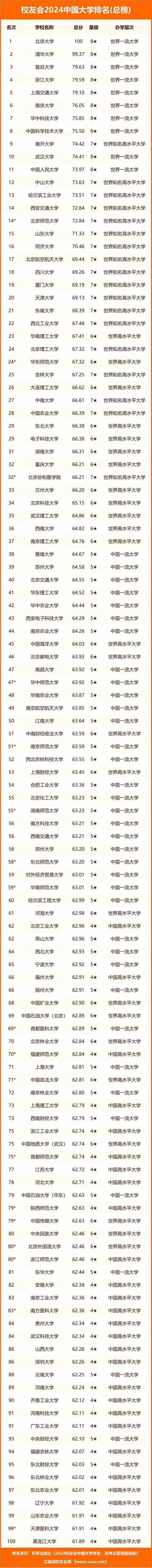 与软科排名不同,校友会排名更注重大学在社会声誉、毕业生影响力等方面的表现。2024年,校友会的排名情况也值得关注。以下是校友会2024年全国大学前100名的具体排名: