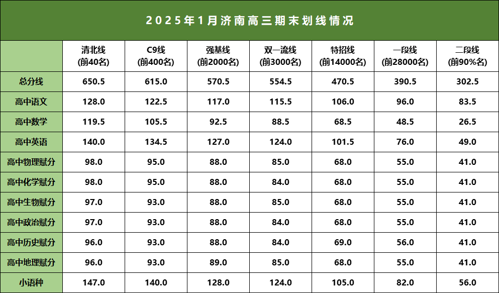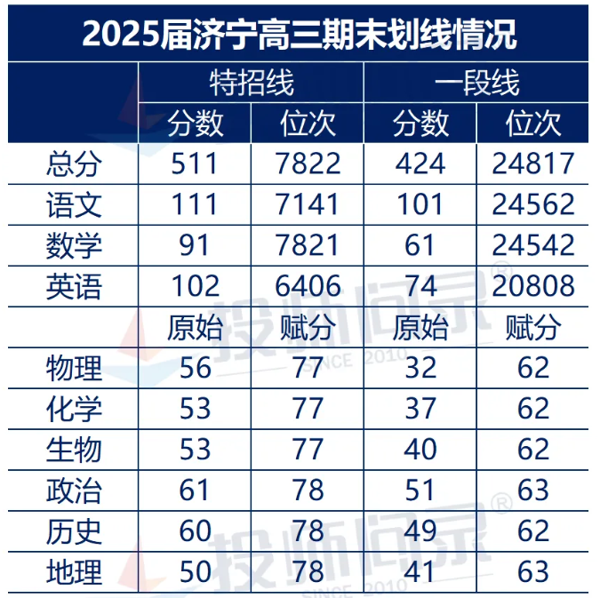 2025年山东各地高三期末考分数划线如下:济宁一段线424分,特招线511分;淄博一段线396.8分,特招线488.9分。