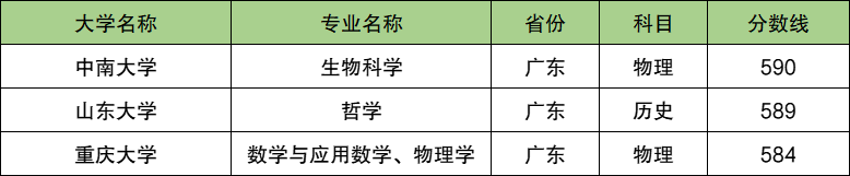 2024年广东省入围分数在580分左右的强基大学共有3所,其中中南大学对应招生专业为生物科学,对应最低入围分数为590分。