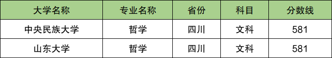 2024年四川省入围分数在580分左右的强基大学共有2所,其中中央民族大学对应招生专业为哲学,对应最低入围分数为581分。