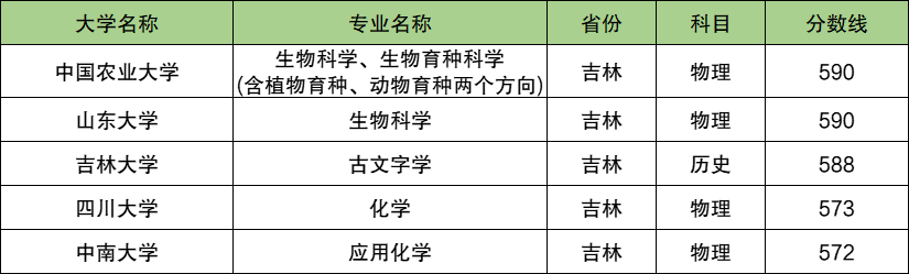 2024年吉林省入围分数在580分左右的强基大学共有5所,其中中国农业大学对应招生专业为生物科学、生物育种科学(含植物育种、动物育种两个方向),对应最低入围分数为590分。