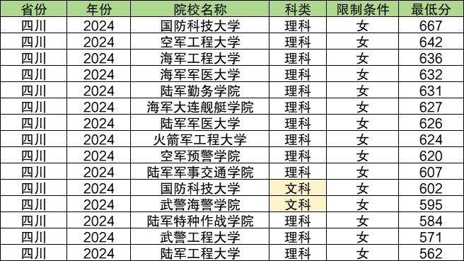 2024年女生考562分能上军校,收分最低的军校是陆军工程大学。但是女生如果想考上国防科技大学的话,最低则需要602分。国防科技大学2024年女生录取分数线:文科602分、理科667分。