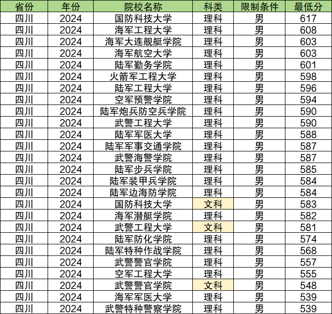2024年男生考539分能上军校,收分最低的军校有两所,分别是海军军医大学和武警特种警察学院。但是男生如果想考上国防科技大学的话,最低则需要583分。国防科技大学2024年男生录取分数线:文科583分、理科617分。
