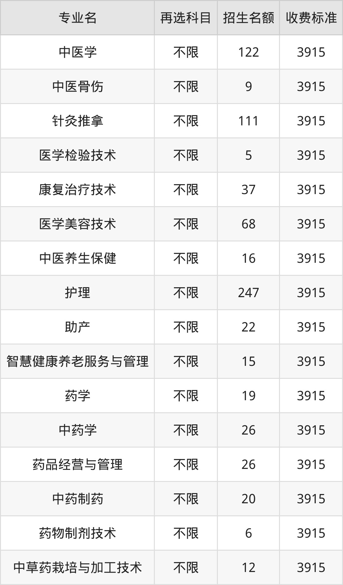 江西中医药高等专科学校在历史组高职专科招生的各个专业,每年的学费是3915元。招生人数最多的专业是护理,2024年招247人,学费是3915元。