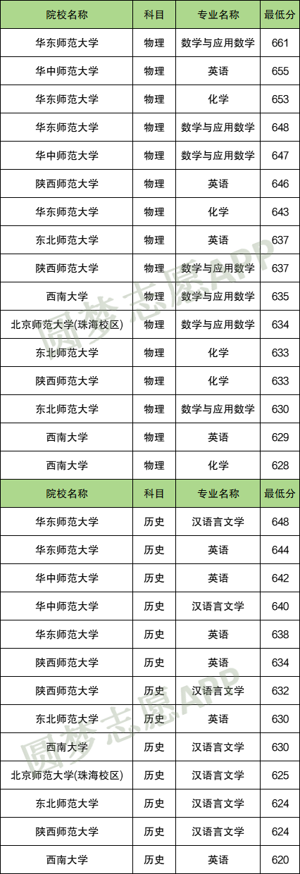 在历史组中,华东师范大学的汉语言文学专业分数最高,对应648分;西南大学的英语专业分数最低,对应620分。