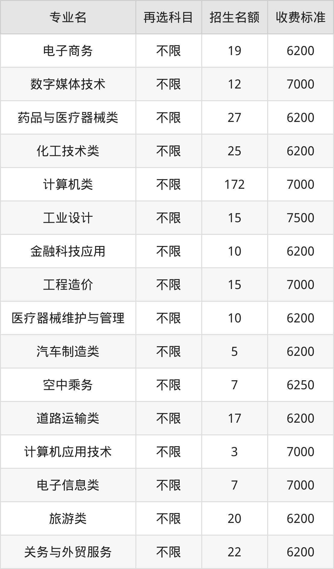 重庆工业职业技术学院在历史组高职专科批招生的各个专业,每年的学费是6200元-7500元。招生人数最多的专业是计算机类,2024年招172人,学费是7000元。