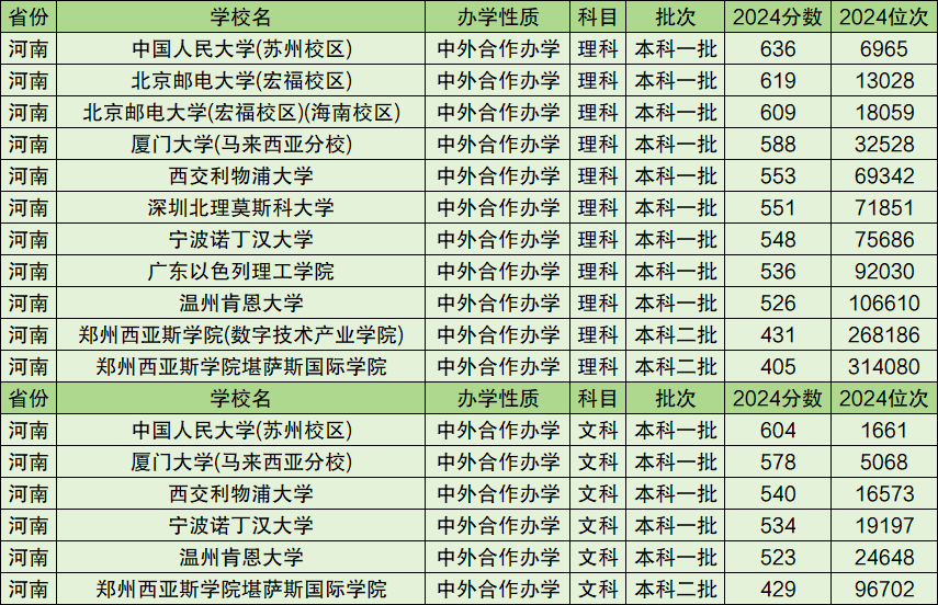 篇幅有限,本文为大家整理中外合办专业/大学在河南省的录取分数线情况,因为在河南省招生的学校,无论是中外合办的大学、还是普通大学的中外合办专业,数量都是比较多的,因此非常具备参考的价值。