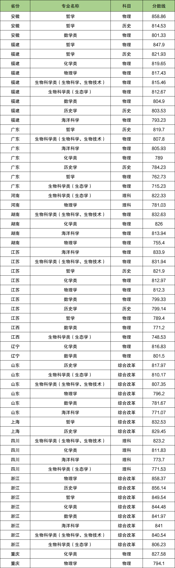 2、厦门大学强基计划在安徽省的最高分为858.86分,最低为801.33分,共计有2个专业。