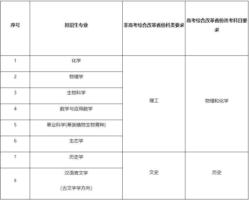 兰州大学强基计划招生专业有化学、物理学、生物科学、数学与应用数学、草业科学(草类植物生物育种)、生态学、历史学、汉语言文学(古文字学方向)