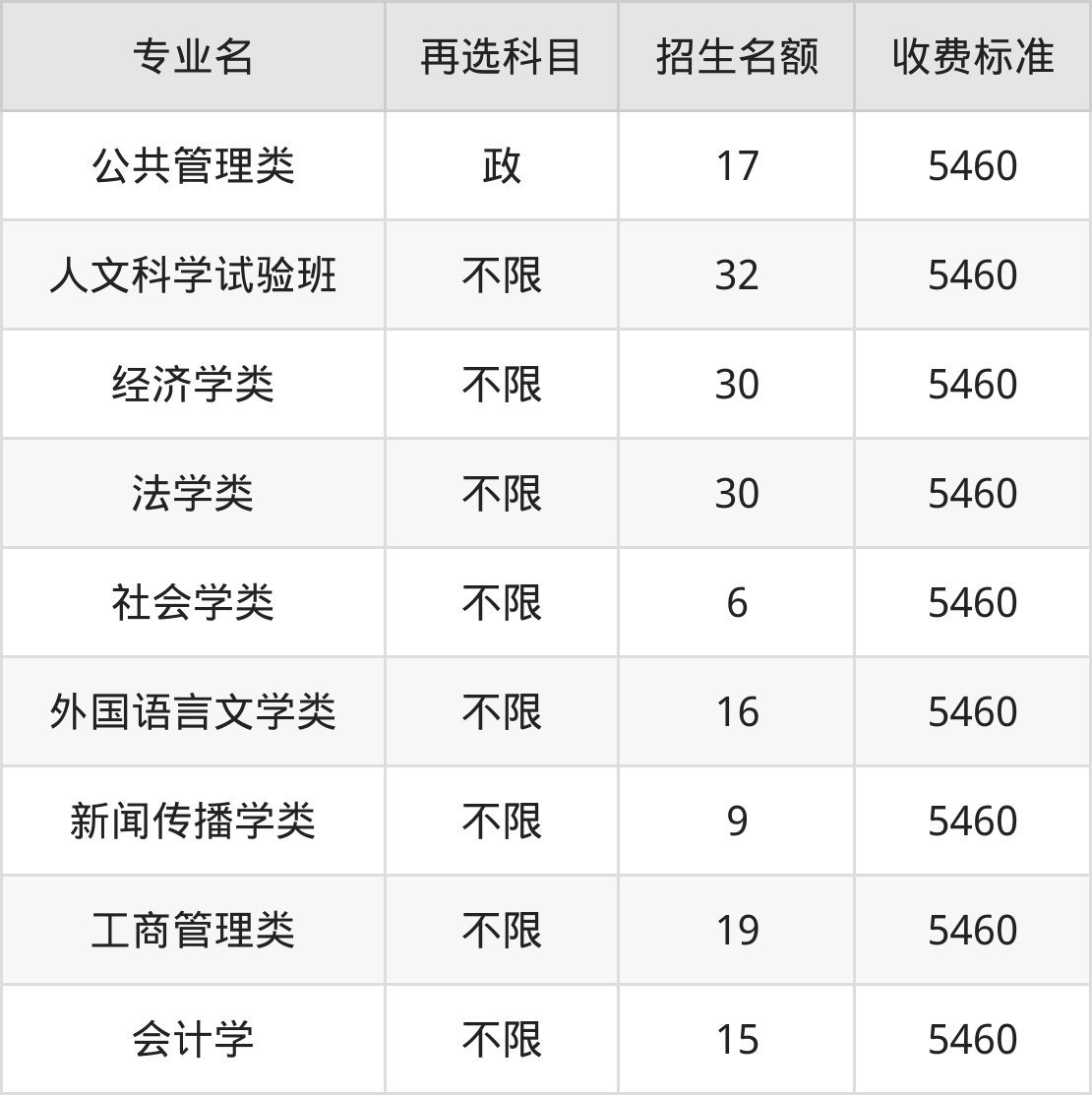 厦门大学在历史组本科批招生的各个专业,每年的学费是5460元。招生人数最多的专业是人文科学试验班,2024年招32人,学费是5460元。