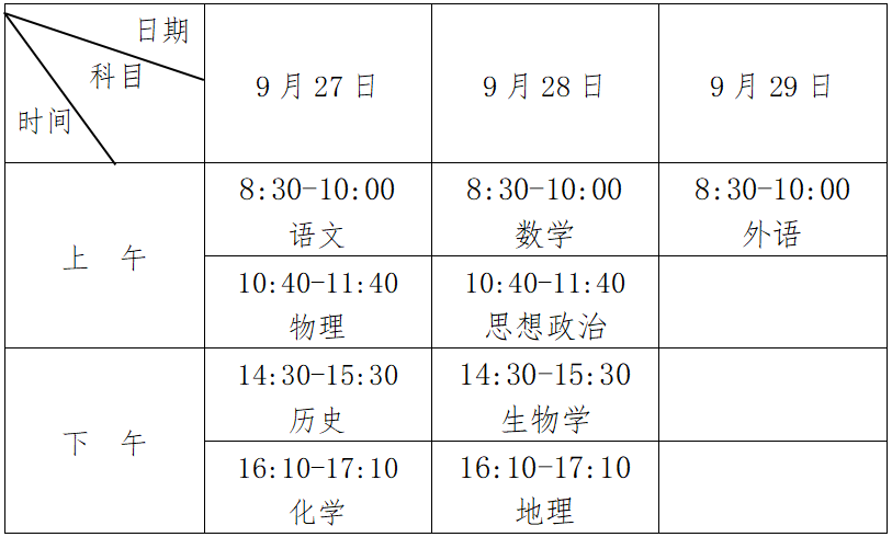 其余9科为语文、数学、外语、物理、思想政治、历史、生物学、化学以及地理,考试时间集中在9月27日-29日,具体安排可见下表: