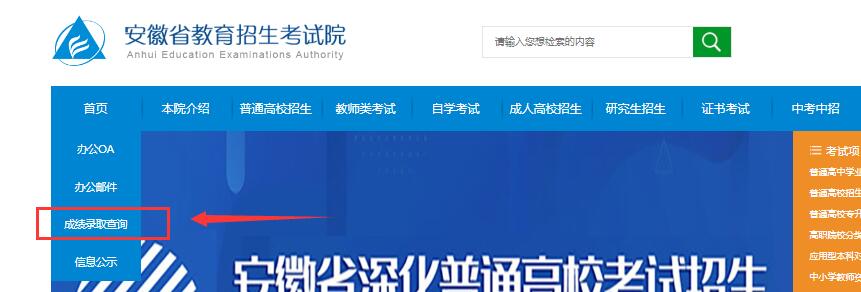 登录“安徽省教育招生考试院”官网首页——点击导航栏“成绩录取查询”项——在【考试查询】页面选择对应考试查询项——输入个人信息即可直接登录查询。