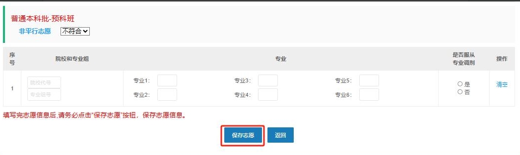 修改密码完成后重新登录系统,选择相应的批次进行志愿填报,填报时应选择所学科类,输入院校代号和专业代号进行填报,志愿填写完成后需要点击“确认提交”按钮,保存志愿信息。