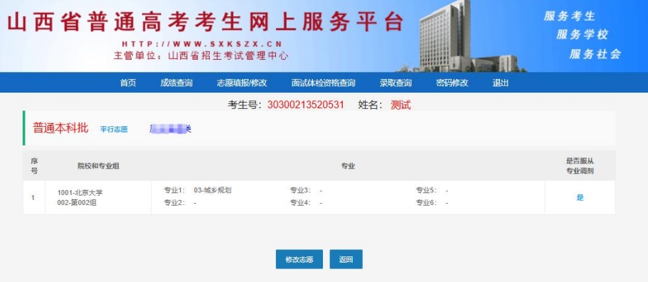 志愿填报完成后,考生显示如下页面,显示考生报考的院校,专业组,专业,是否服从专业调剂。考生若需要修改志愿,点击【修改志愿】按钮,进入修改界面,修改完成后点击【保存志愿】,输入密码点击【确定】完成志愿修改。修改成功后会返回志愿查看界面如下图所示。