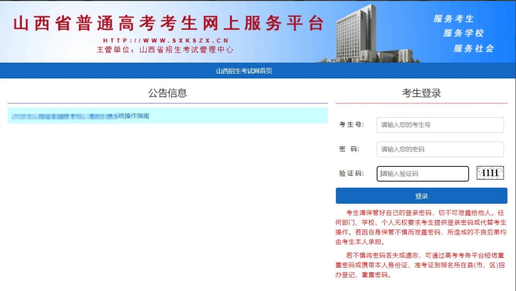 各位山西考生可从上文入口网址进入山西省普通高考考生网上服务平台,选择志愿填报选项,进入系统登录页面,输入考生号、密码、验证码进行登录。