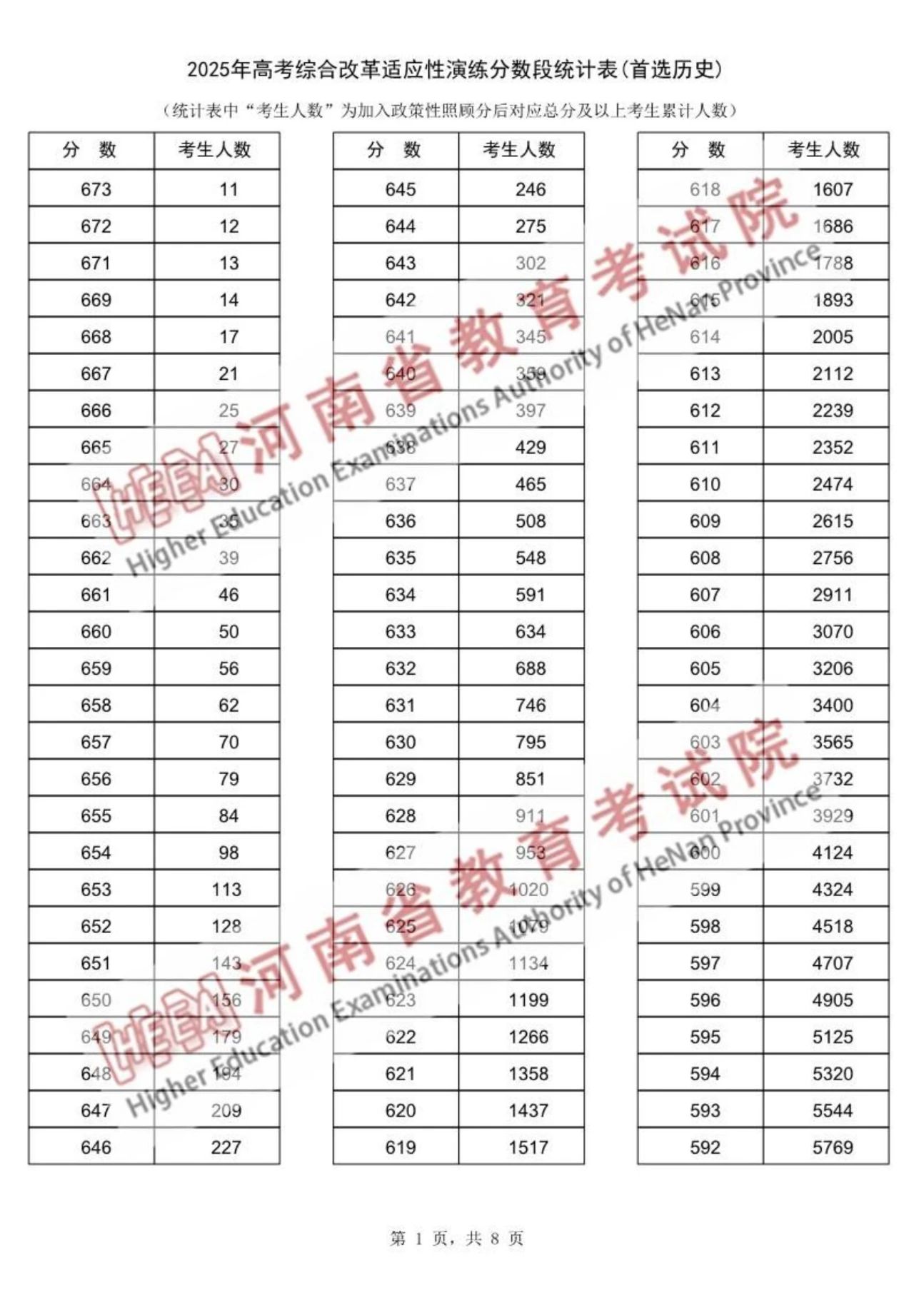 2025年河南历史组考生累计人数360760名(100分及以上),高分段673分,累计人数11人;600分及以上4124名、500分及以上54950名。