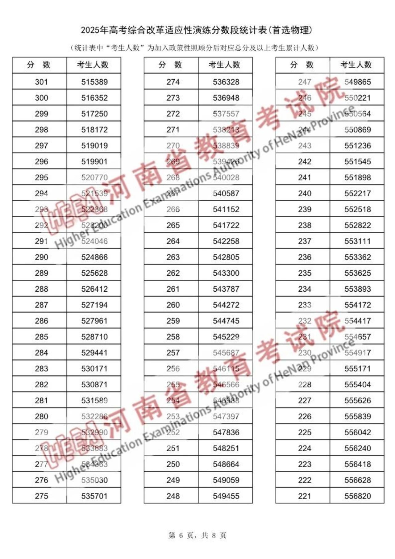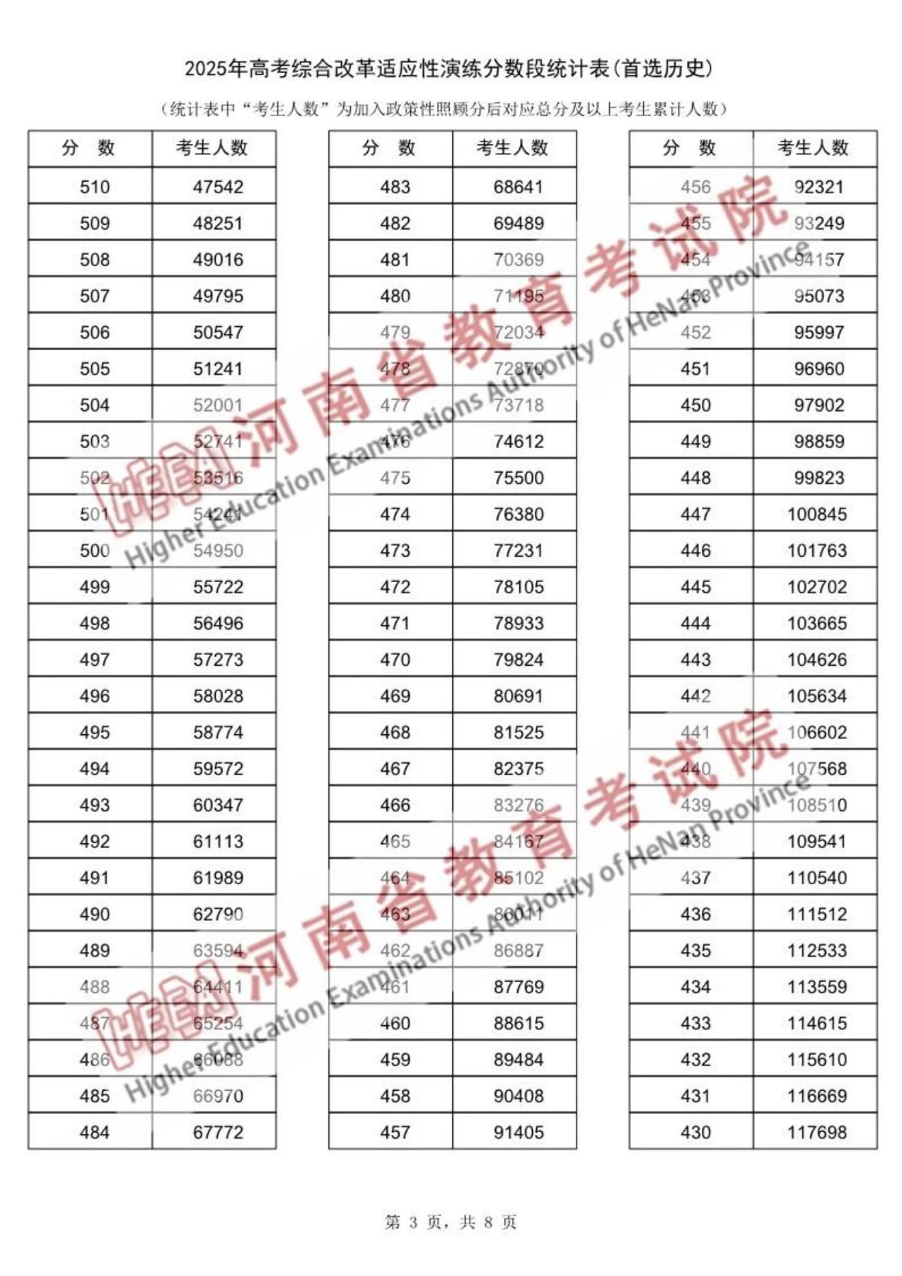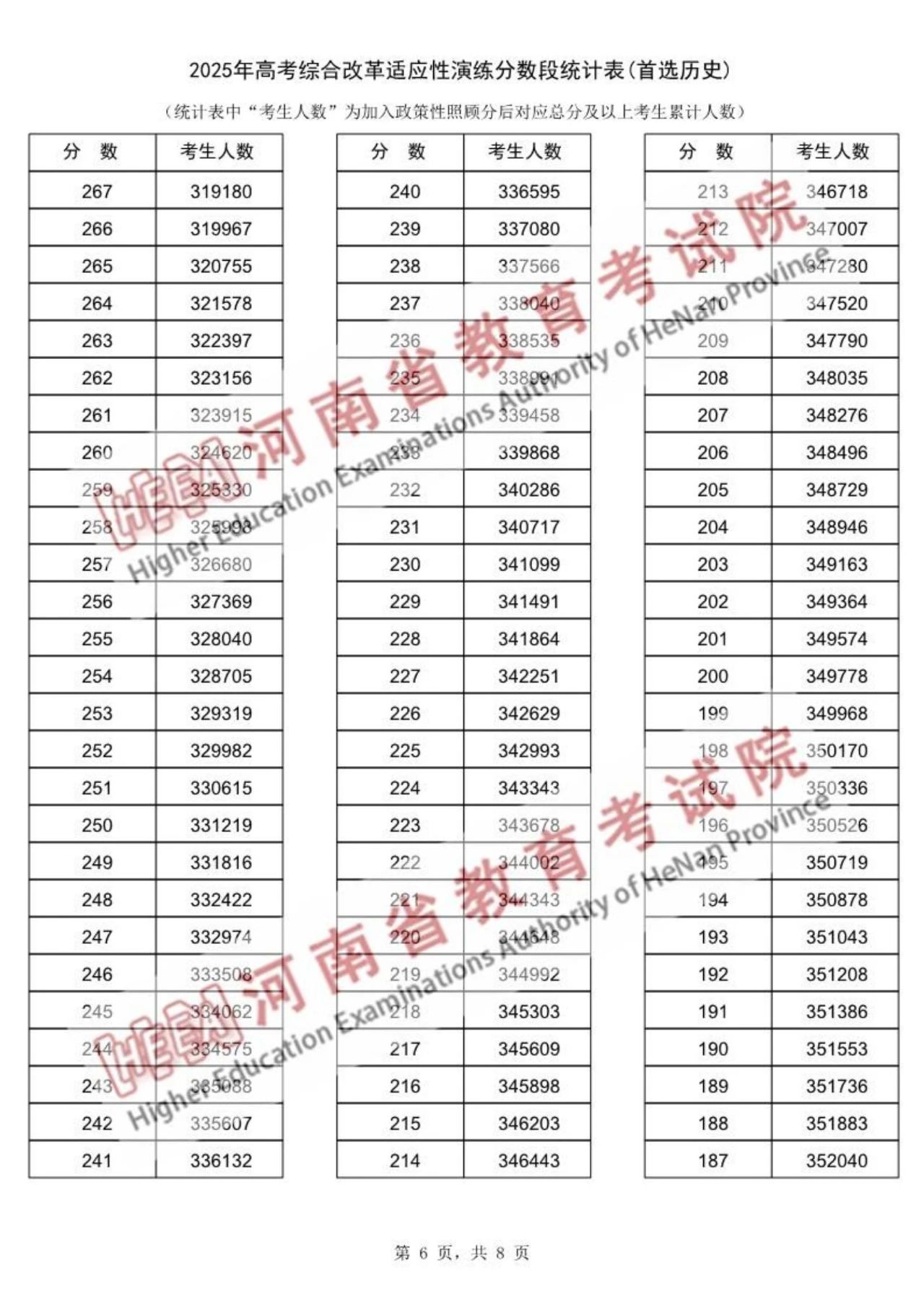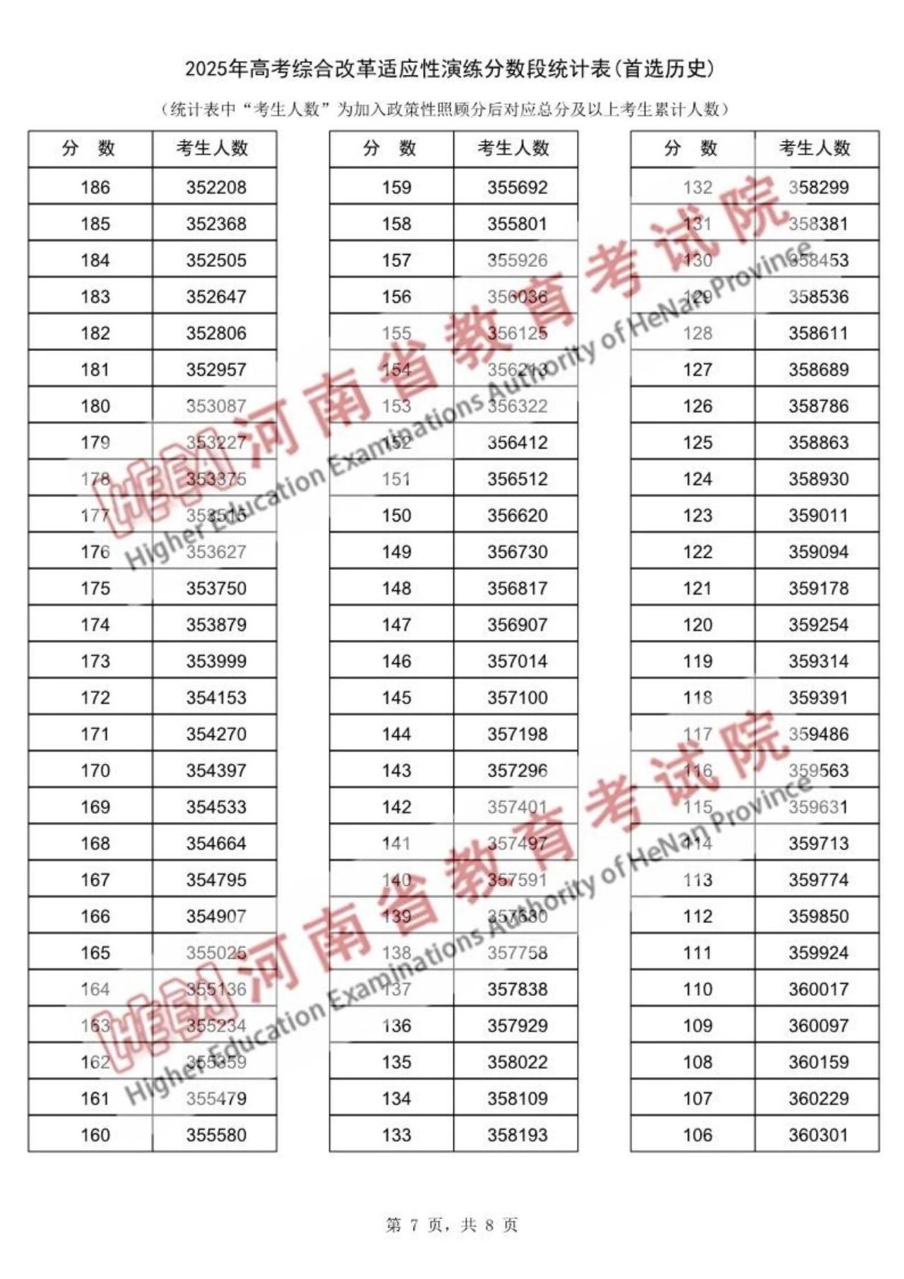 2025年河南历史组考生累计人数565208名(100分及以上),高分段707分,累计人数10人;600分及以上39912名、500分及以上214426名。