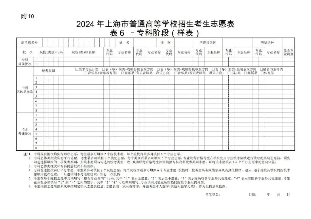 以下为2024年上海志愿填报样表: