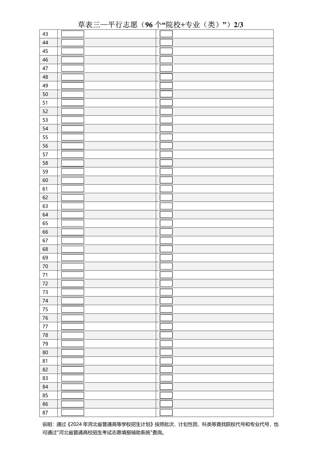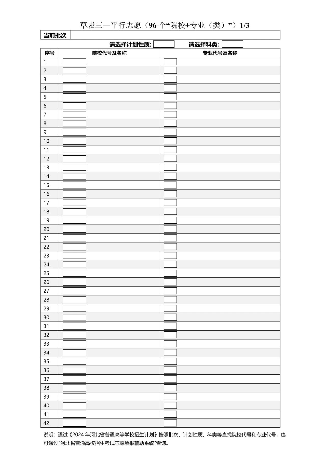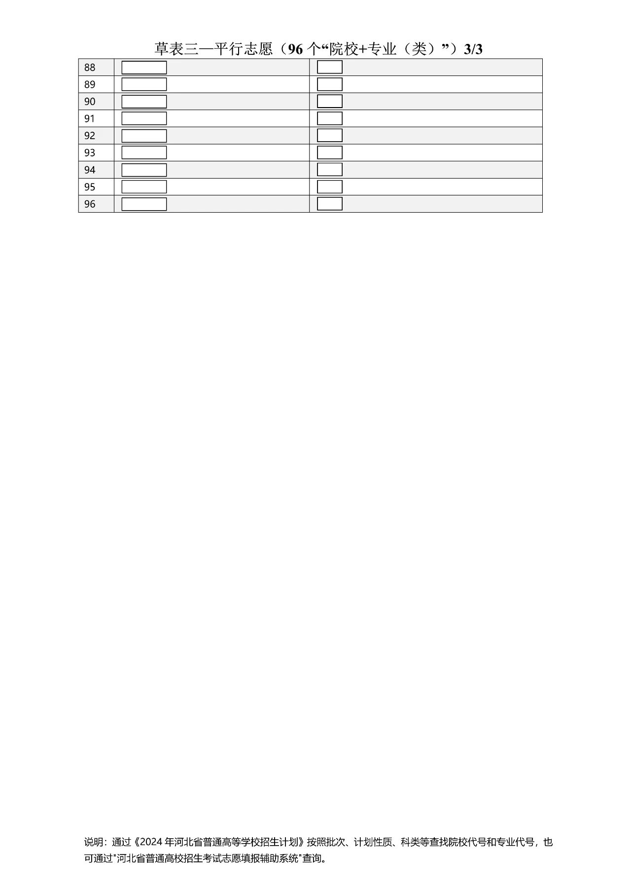 以下为2024年河北高考志愿96个平行志愿填报样表:
