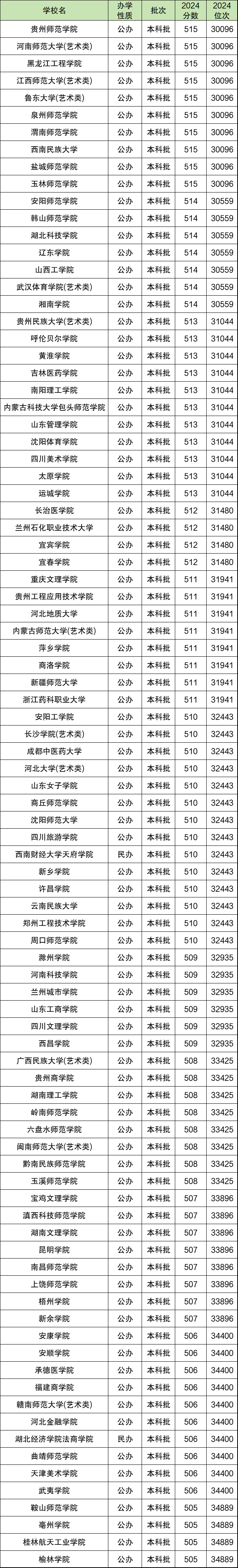 3万-3.5万名中最低位次对应的大学是桂林航天工业学院、亳州学院等4所院校,最低录取位次为34889位,位次对应分数为505分。