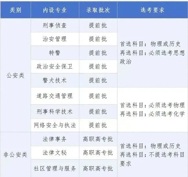非公安类专业:不提选考科目要求,专业包含法律事务、法律文秘、社区管理与服务。