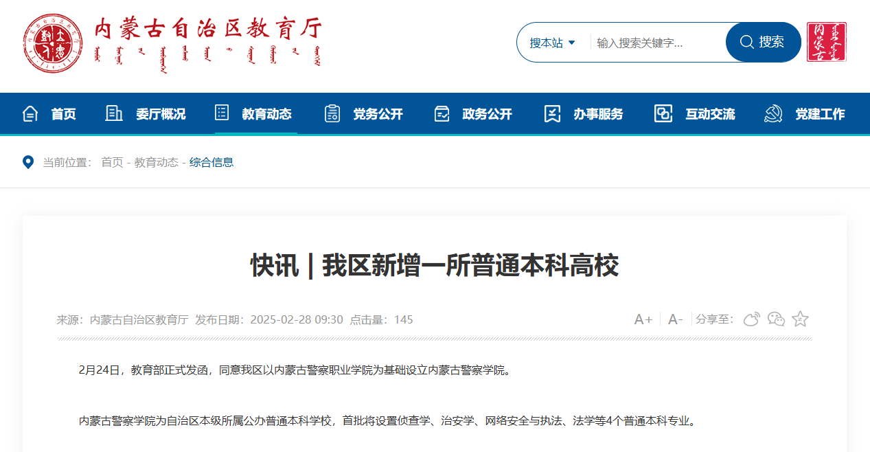 根据教育部发函内容,2025年内蒙古警校已经升本,目前区内只有1所警校,即内蒙古警察学院(原内蒙古警察职业学院),其将在2025年首次招收本科生。