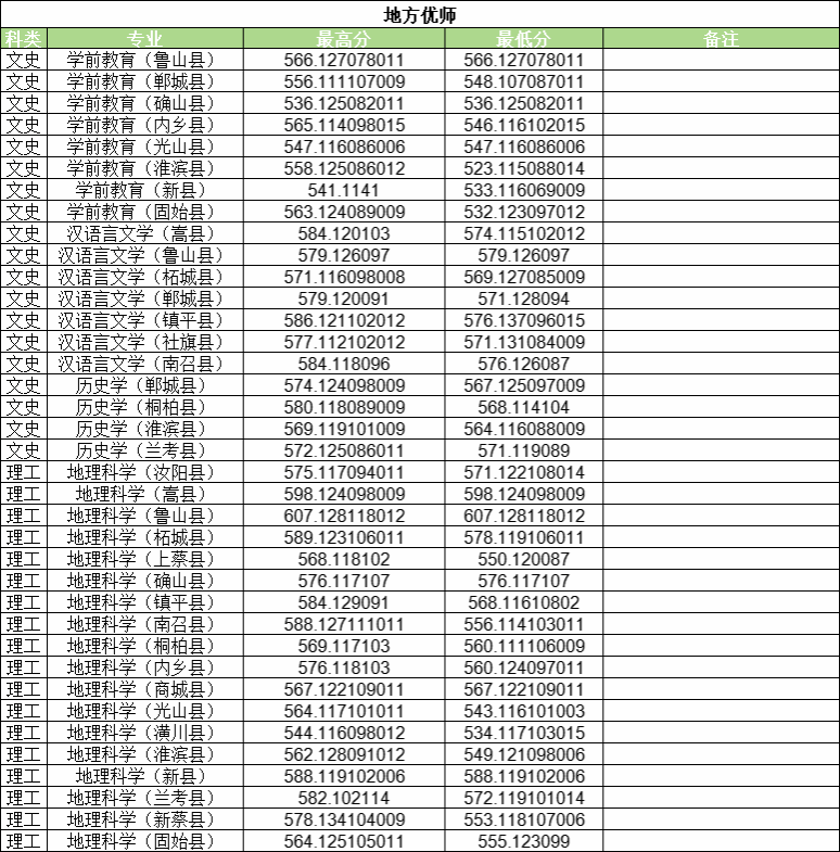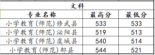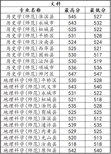 文科各专业最低分汇总:汉语言文学528分(光山县)、思想政治教育522分(拓城县)、英语516分(淮滨县)、地理科学523分(沁阳县);