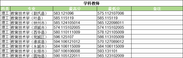 2024年学校的学科教师最低分是565分,对应的地区是固始县。优师专项最低分:文科是523分、理科是534分。