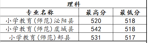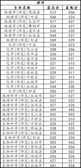 理科个专业最低分汇总:英语517分(淮滨县)、地理科学506分(沁阳县)、数学与应用数学507分(罗山县)、化学510分(淮滨县)、生物科学511分(罗山县)、应用心理学518分(永城市)。