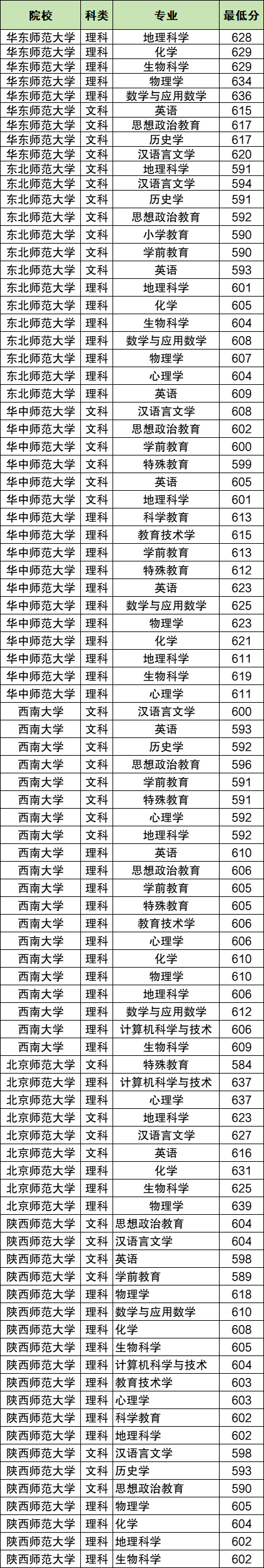 2024年河南国家公费师范招生录取中,北京师范大学理科最低分为625分,西南大学理科最低分为605分,文科最低分为591分;河南大学地方公费师范生最低分为:文科512分、理科495分。