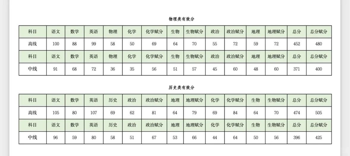 中线(本科线):总分400分。语文91分、数学68分、英语72分、物理36分、化学56分(赋分后)、生物57分(赋分后)、政治60分(赋分后)、地理60分(赋分后)。