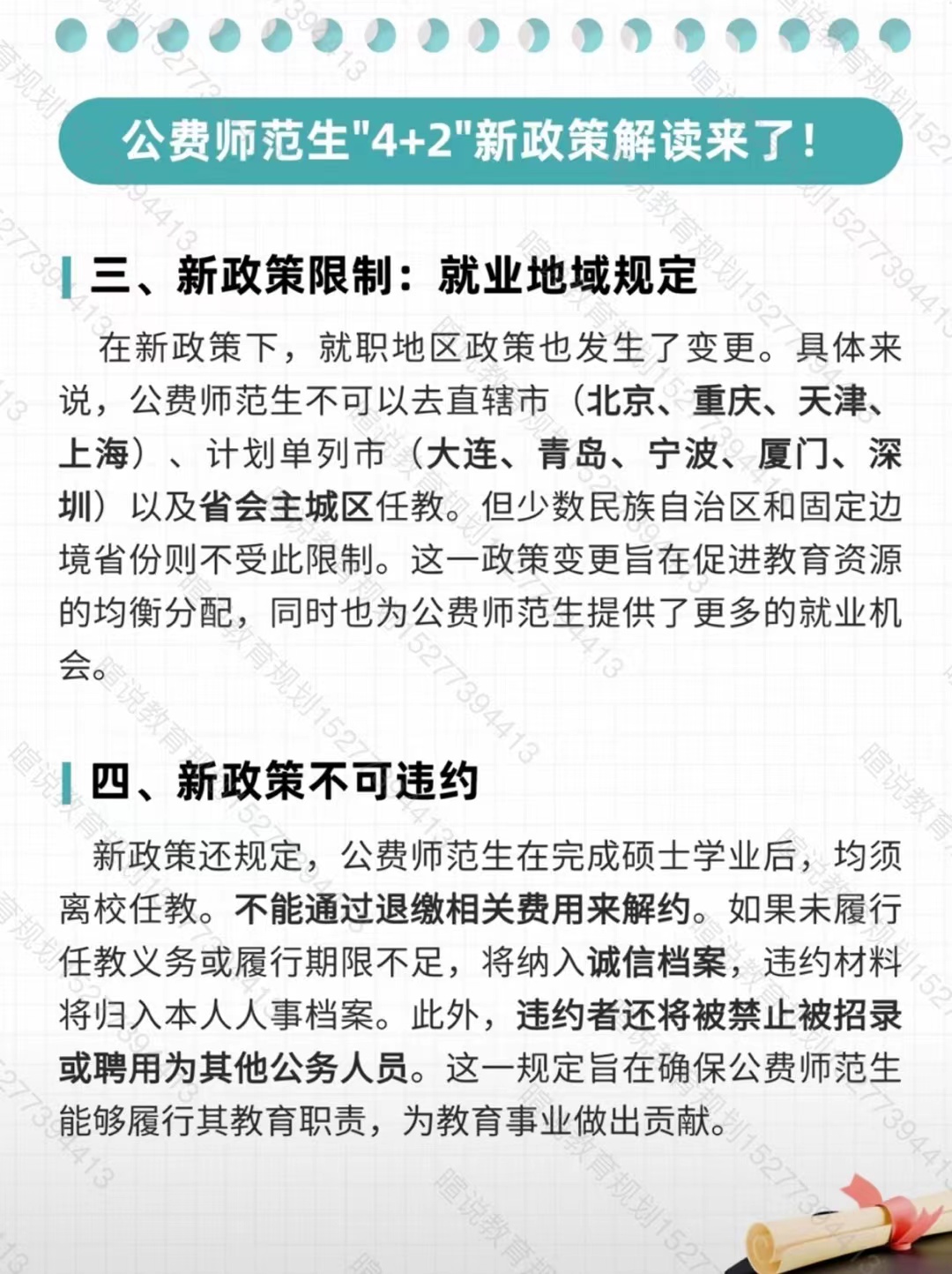 4、新政策是不可违约,硕士毕业后必须任教,回生原省从事中小学教育6年至少;如果违约除开赔钱外,以后不允许从教,也不允许编制(含公务员)。